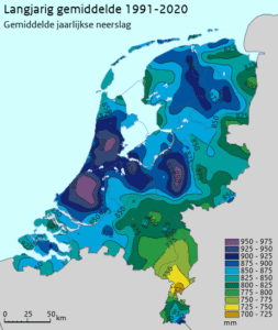 - Gemiddeld valt er in Nederland zo’n 853 millimeter neerslag per jaar.